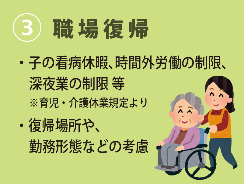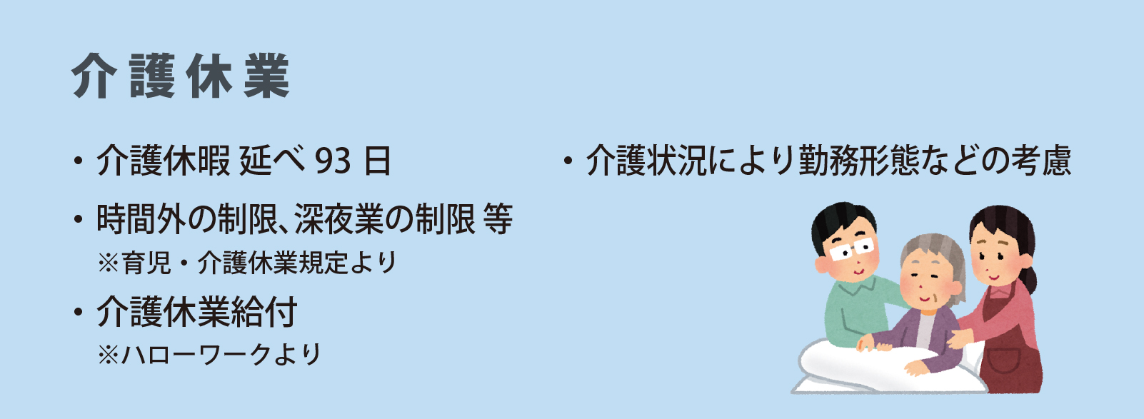 ※法人への申し出により残業や夜間勤務の免除も可能です。